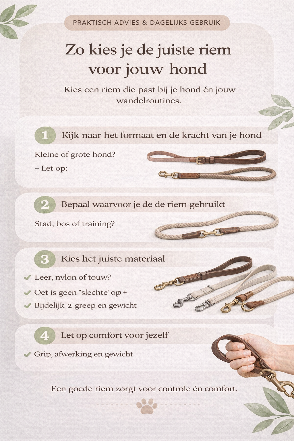 Een riem lijkt een simpel product. Toch bepaalt de juiste keuze hoeveel controle, comfort en veiligheid je ervaart tijdens elke wandeling. Niet elke riem past bij elke hond — of bij elke situatie.